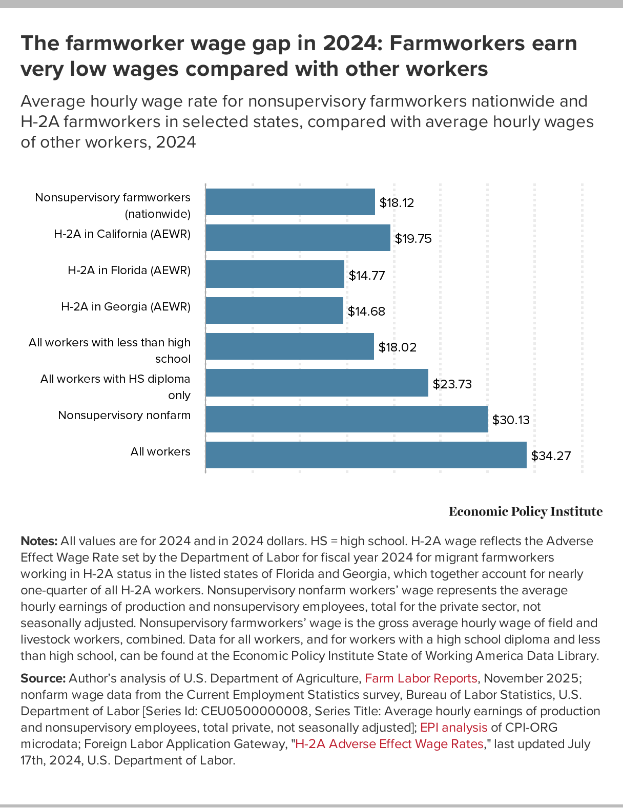 Notes: All values are for 2024 and in 2024 dollars. HS = high school. H-2A wage reflects the Adverse Effect Wage Rate set by the Department of Labor for fiscal year 2024 for migrant farmworkers working in H-2A status in the listed states of Florida and Georgia, which together account for nearly one-quarter of all H-2A workers. Nonsupervisory nonfarm workers’ wage represents the average hourly earnings of production and nonsupervisory employees, total for the private sector, not seasonally adjusted. Nonsupervisory farmworkers’ wage is the gross average hourly wage of field and livestock workers, combined. Data for all workers, and for workers with a high school diploma and less than high school, can be found at the Economic Policy Institute State of Working America Data Library.
