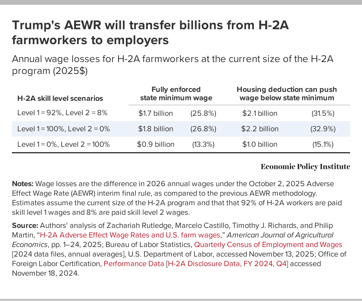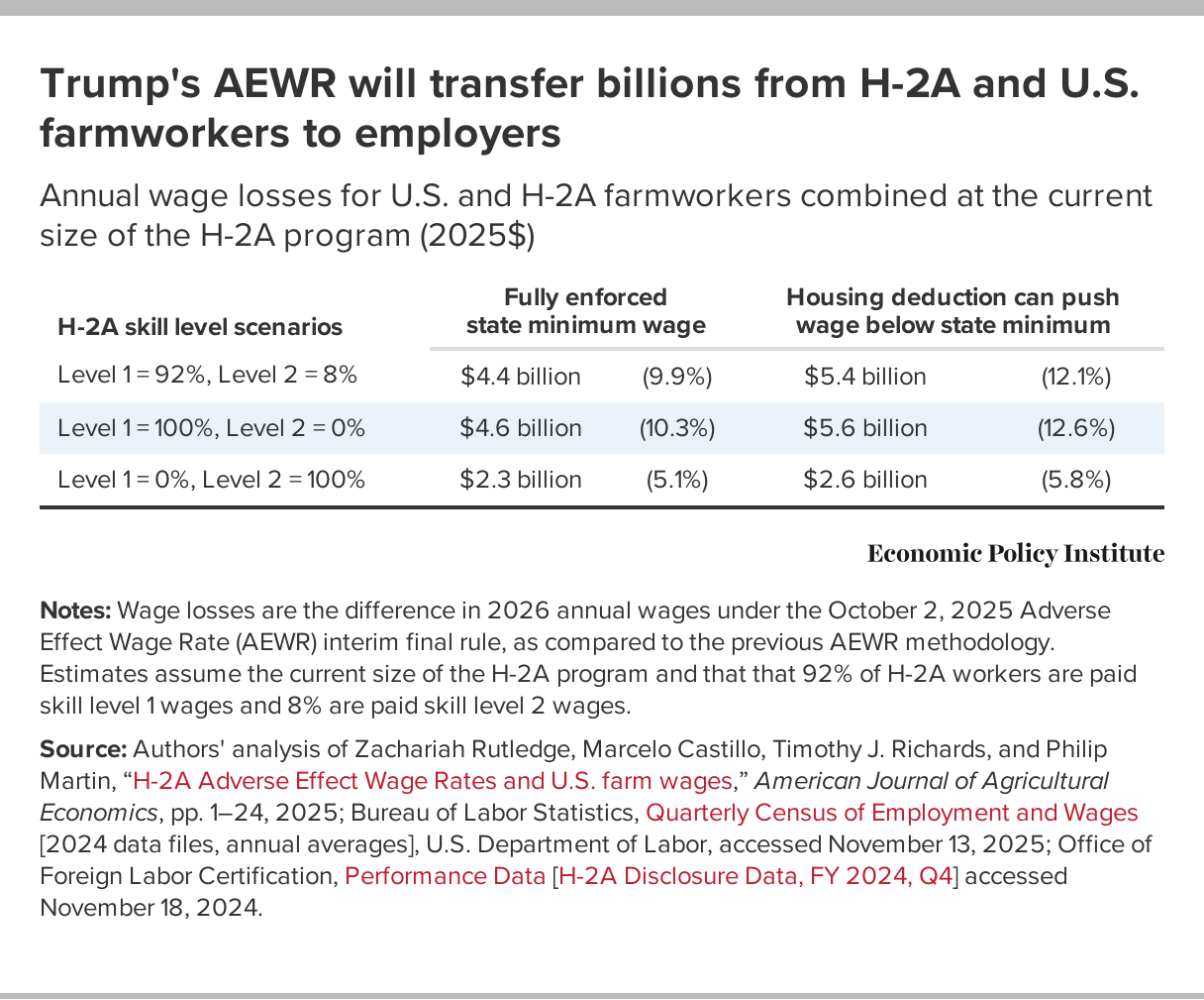 27. For the full methodology, see the appendix in Daniel Costa and Ben Zipperer, “Trump’s new H-2A wage rule will radically cut the wages of all farmworkers: New estimates show farmworkers stand to lose $4.4 to $5.4 billion annually under DOL’s updated Adverse Effect Wage Rate,” Working Economics blog (Economic Policy Institute), November 26, 2025.