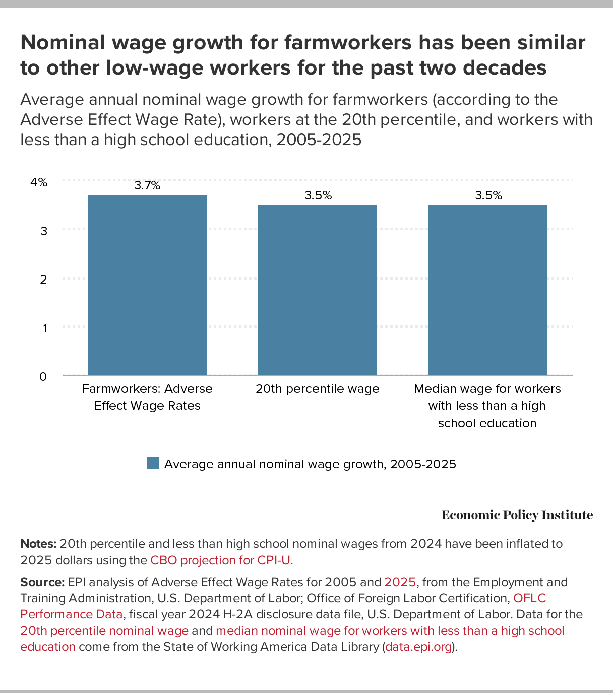 Nominal wage growth for farmworkers has been similar to other low-wage workers for the past two decades: Average annual nominal wage growth for farmworkers (according to the Adverse Effect Wage Rate), workers at the 20th percentile, and workers with less than a high school education, 2005-2025