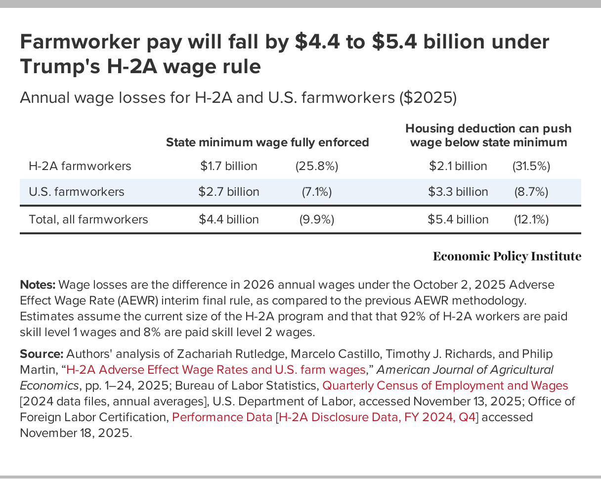 2. See Daniel Costa and Ben Zipperer, “Trump’s new H-2A wage rule will radically cut the wages of all farmworkers: New estimates show farmworkers stand to lose $4.4 to $5.4 billion annually under DOL’s updated Adverse Effect Wage Rate,” Working Economics blog (Economic Policy Institute), November 26, 2025.