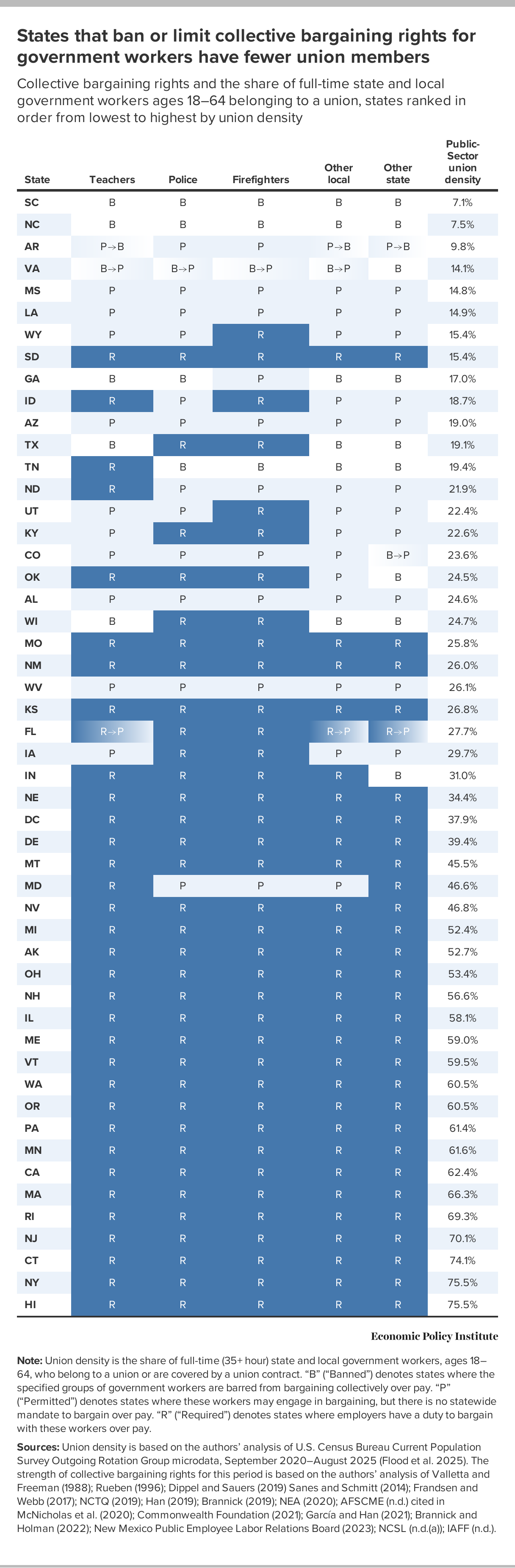 Sources: Union density is based on the authors’ analysis of U.S. Census Bureau Current Population Survey Outgoing Rotation Group microdata, September 2020–August 2025 (Flood et al. 2025). The strength of collective bargaining rights for this period is based on the authors’ analysis of Valletta and Freeman (1988); Rueben (1996); Dippel and Sauers (2019) Sanes and Schmitt (2014); Frandsen and Webb (2017); NCTQ (2019); Han (2019); Brannick (2019); NEA (2020); AFSCME (n.d.) cited in McNicholas et al. (2020); Commonwealth Foundation (2021); García and Han (2021); Brannick and Holman (2022); New Mexico Public Employee Labor Relations Board (2023); NCSL (n.d.(a)); IAFF (n.d.).