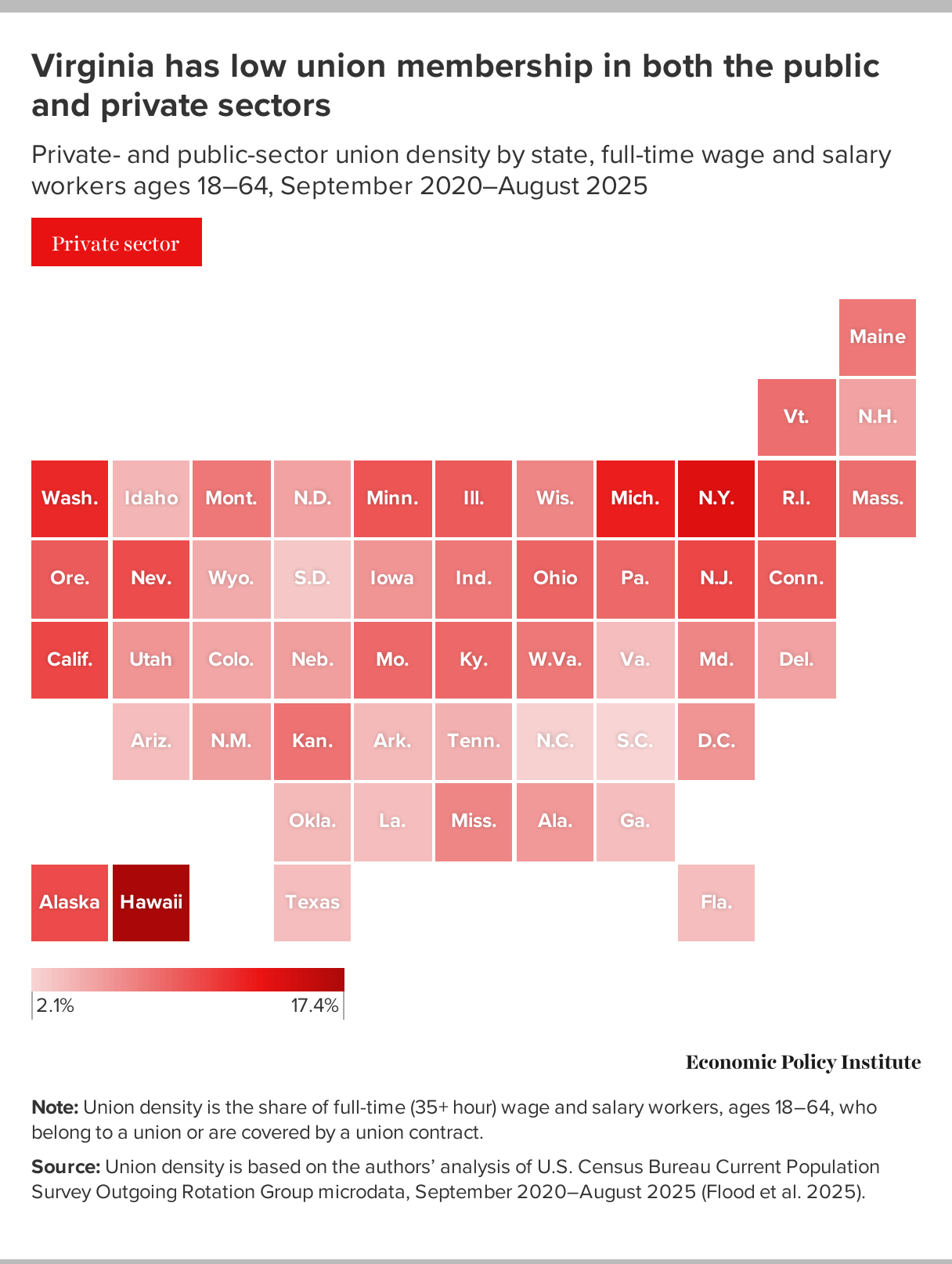 As a result of these long-standing anti-union state policies, unionization rates in Virginia for both public- and private-sector workers are well below national averages.