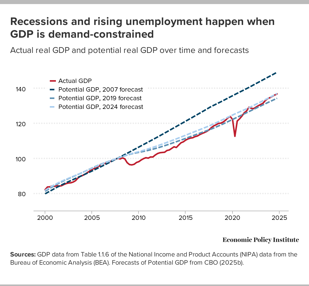 [2] For this calculation, assume a counterfactual in which the unemployment rate stood at 4.0% over the 2007–2017 period and multiply by the size of the labor force in each year. Then, subtract this level of unemployment from the actual rate and sum over the years. For evidence of the damage this excess unemployment did to wage growth, particularly for lower-wage workers, see Gould et al. 2025.