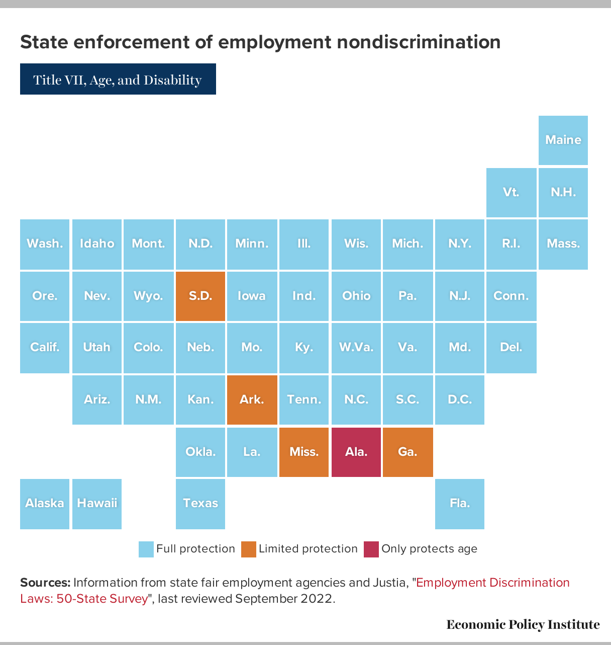 Sources: Information from state fair employment agencies (AK, AZ, CA, CO, CT, DE, DC, FL, GA, HI, ID, IL, IN, IA, KS, KY, LA, ME, MD, MA, MI, MN, MO, MT, NE, NV, NH, NJ, NM, NY, NC, ND, OH, OK, OR, PA, RI, SC, SD, TN, TX, UT, VT, VA, WA, WV, WI, WY), and Justia, "Employment Discrimination Laws: 50-State Survey", last reviewed September 2022.